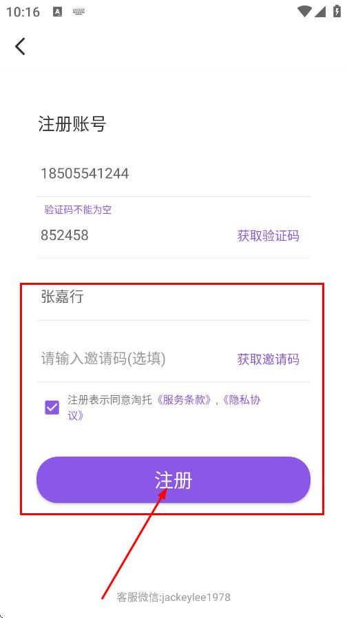 4、輸入真實姓名等信息,勾選同意協(xié)議后,點擊注冊,完成注冊。