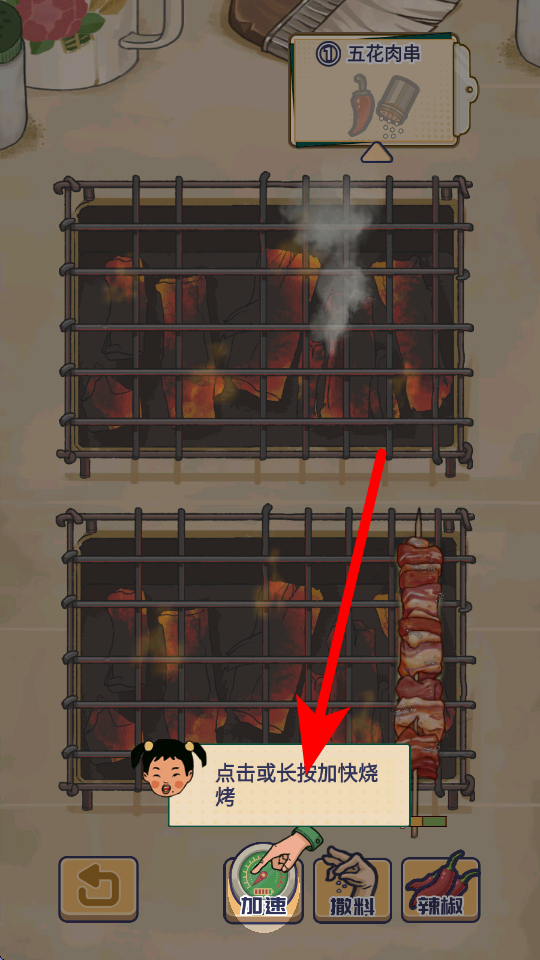 3、在烤制過程中,可點擊或長按加速按鈕,加快燒烤的進度,讓顧客能更快吃到美味的燒烤,提升經(jīng)營效率,增加收益。