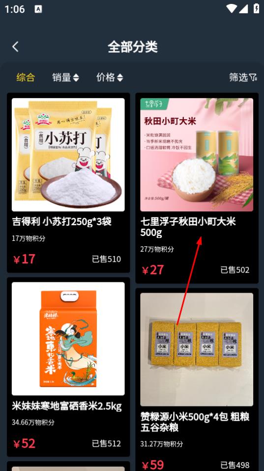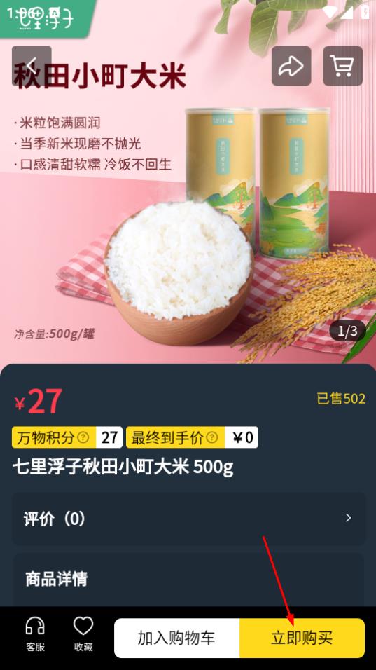 3、選擇想要購買的大米,比如七里浮子秋田小町大米500g。