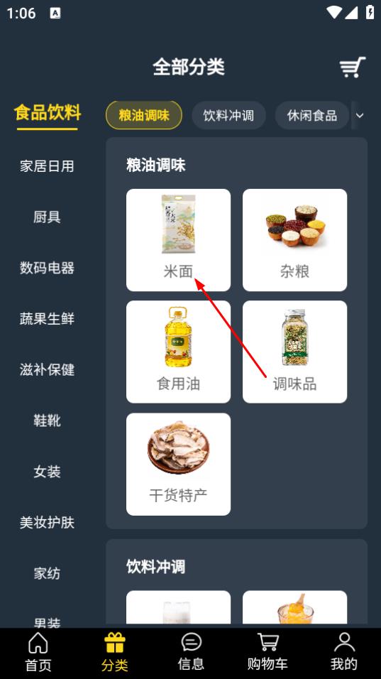 2、在全部分類頁面,選擇糧油調(diào)味下的米面分類。