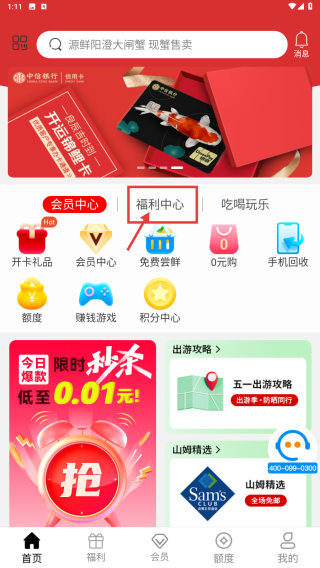 1、打開綜合服務(wù)應(yīng)用,點擊福利中心選項,進(jìn)入福利功能頁面。