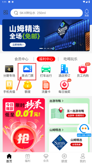 2、在福利中心頁面,點擊景點門票選項,進(jìn)入門票預(yù)訂界面。