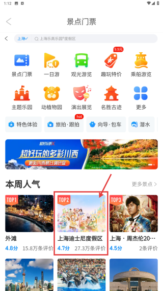 3、在景點門票頁面,找到上海迪士尼度假區(qū)條目,點擊進(jìn)入詳情頁。