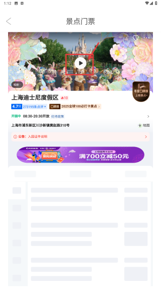 4、在上海迪士尼度假區(qū)詳情頁,點擊播放按鈕,查看景區(qū)相關(guān)信息。
