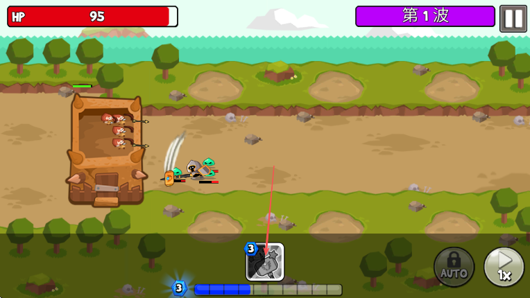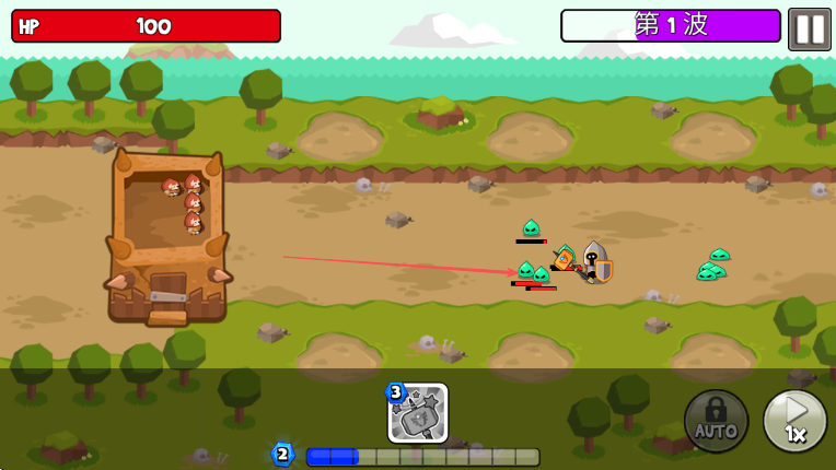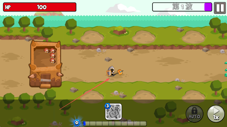 1、進入游戲查看HP100和第1波信息,操控箭頭所指角色向前移動準備迎敵。