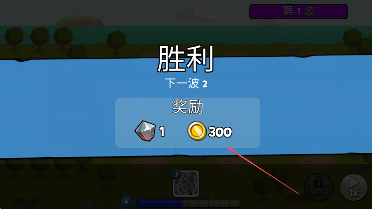 4、成功抵擋住第1波敵人進攻后,獲取1個鉆石和300金幣獎勵,準備迎接下一波敵人。