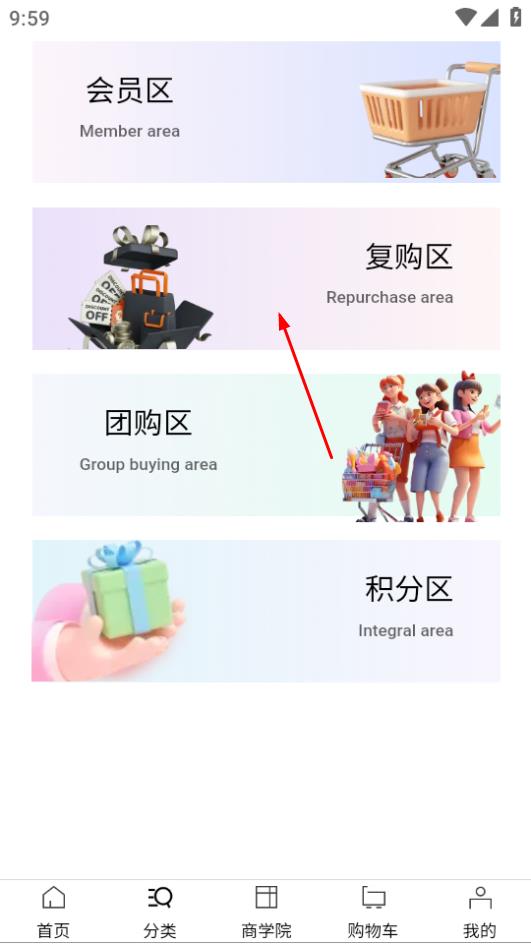 2、在分類頁面,若想進入復購相關(guān)區(qū)域,可點擊復購區(qū)。