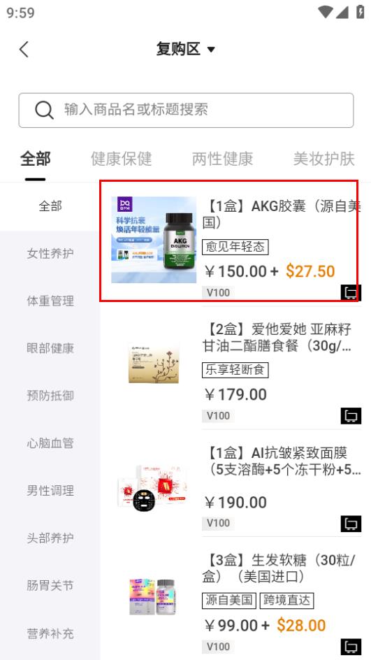 3、進入復購區(qū)后,若對AKG膠囊感興趣,可點擊該商品卡片。