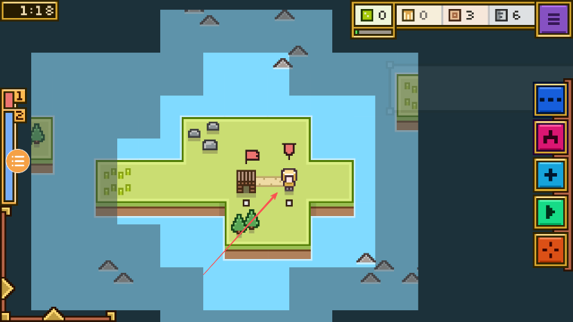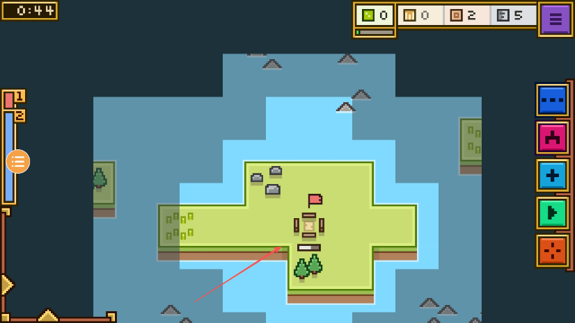 1、進(jìn)入游戲留意上方倒計(jì)時(shí),觀察島嶼地形和初始建筑位置。