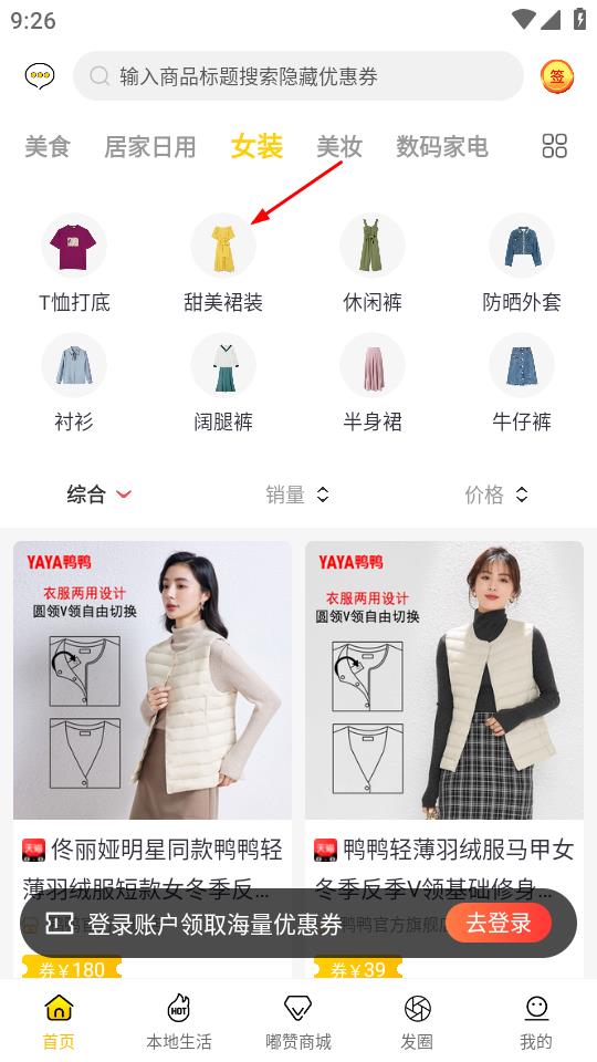 2、在女裝頁面,點(diǎn)擊甜美裙裝分類,查看甜美裙裝類商品。