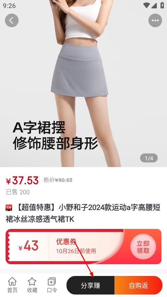 4、在商品詳情頁,可點(diǎn)擊分享賺按鈕進(jìn)行分享返券操作。