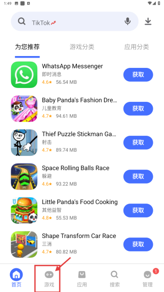 1、打開應(yīng)用商店類應(yīng)用,點(diǎn)擊底部游戲選項(xiàng),進(jìn)入游戲分類頁面。