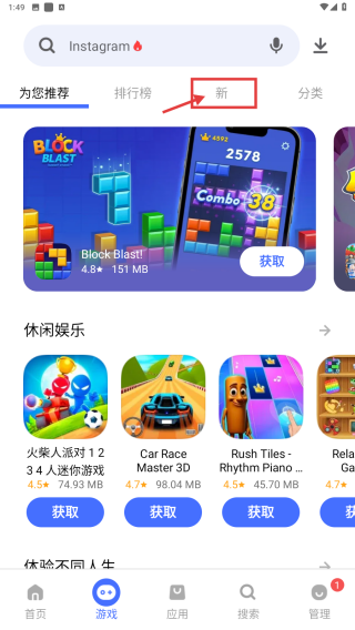 2、在游戲分類頁面,點(diǎn)擊新標(biāo)簽,瀏覽新上線游戲列表。