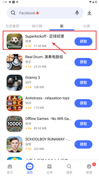 3、在新上線游戲列表中,找到目標(biāo)游戲Superkickoff-足球經(jīng)理,點(diǎn)擊進(jìn)入游戲詳情頁。