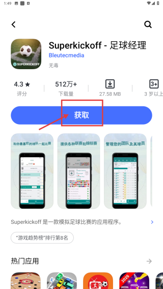 4、在游戲詳情頁,點(diǎn)擊獲取按鈕,開始下載該游戲。
