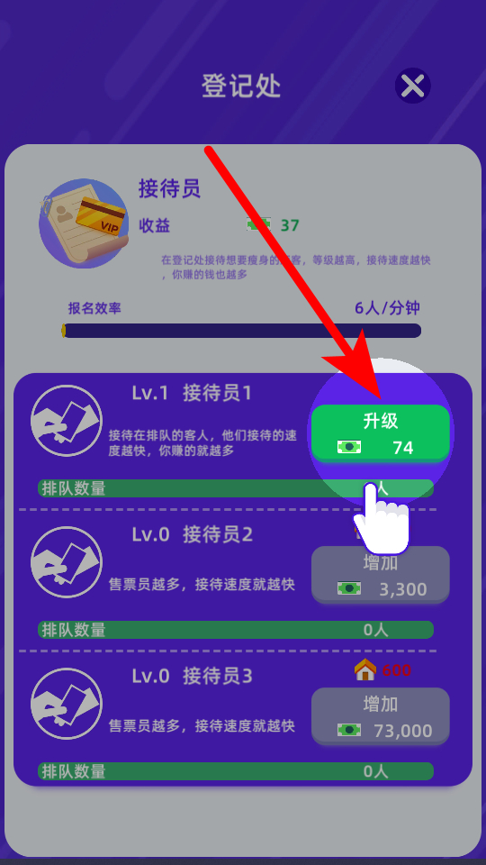 1、在登記處,優(yōu)先點(diǎn)擊升級(jí)按鈕升級(jí)接待員,提升接待速度以增加收益。