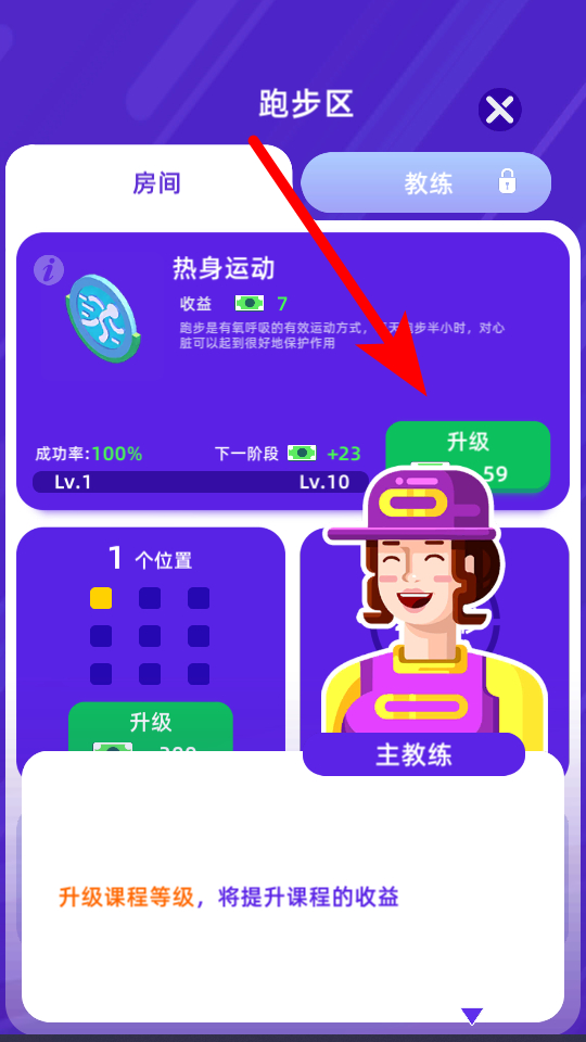 2、進(jìn)入跑步區(qū),點(diǎn)擊熱身運(yùn)動(dòng)對(duì)應(yīng)的升級(jí)按鈕,提升課程等級(jí)來增加收益。