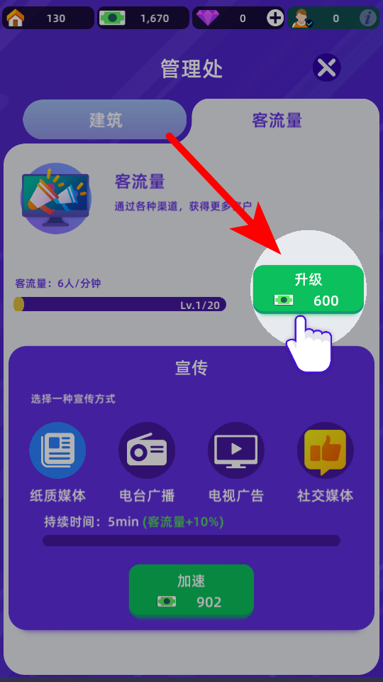 4、在管理處,點(diǎn)擊客流量旁的升級(jí)按鈕,花費(fèi)六百提升客流量等級(jí),吸引更多客戶。