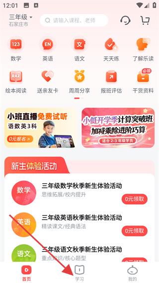 1、在樂讀優(yōu)課首頁(yè),點(diǎn)擊底部學(xué)習(xí),進(jìn)入學(xué)習(xí)頁(yè)面。