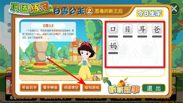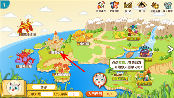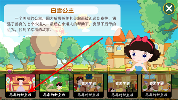 2、在白雪公主故事頁面,選擇故事章節(jié),進(jìn)入該章節(jié)學(xué)習(xí)頁面。