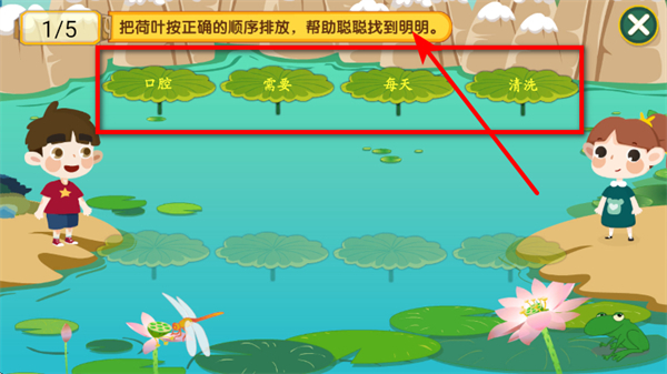 4、在詞句游戲中,按正確順序排列荷葉上的詞語,完成游戲任務(wù)。