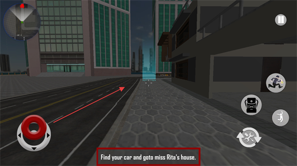 1、進入游戲查看下方提示Find your car and goto miss Rita's house,通過左邊虛擬搖桿控制角色移動找車。