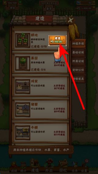 1、進(jìn)入游戲后,可進(jìn)入建造界面,花費(fèi)相應(yīng)貨幣建造耕地,耕地能用來種植更多糧食和蔬菜,助力小院生產(chǎn)。