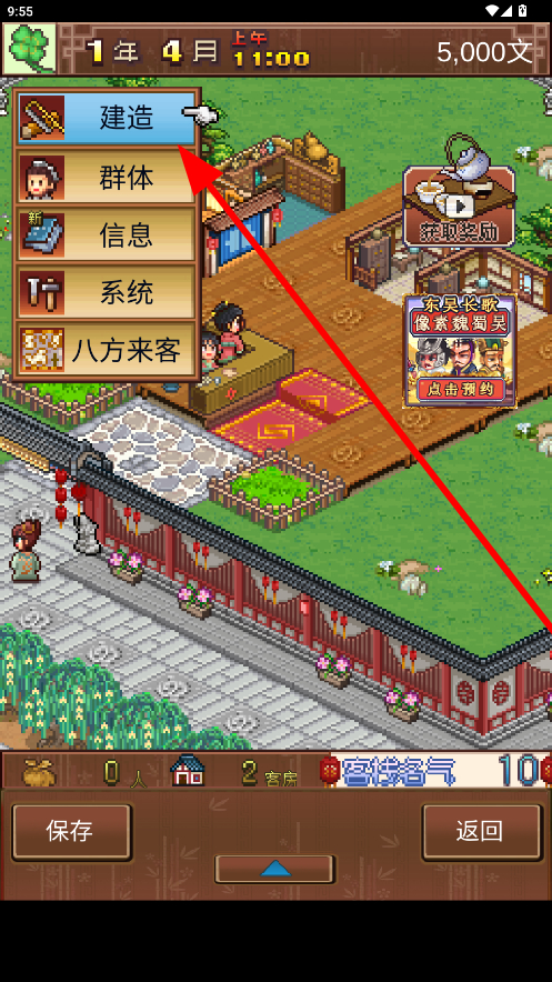 1、點擊建造選項,對客棧內的設施進行規(guī)劃與建設,選擇合適的位置鋪設各類設施,打造完善的客棧布局,為經營打好基礎。