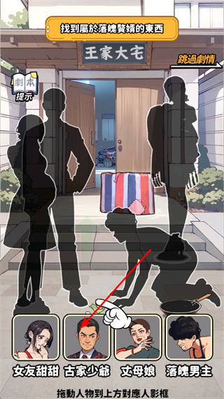 1、在找到屬于落魄贅婿的東西任務(wù)中,拖動人物到上方對應(yīng)人影框,完成相關(guān)的劇情的匹配。