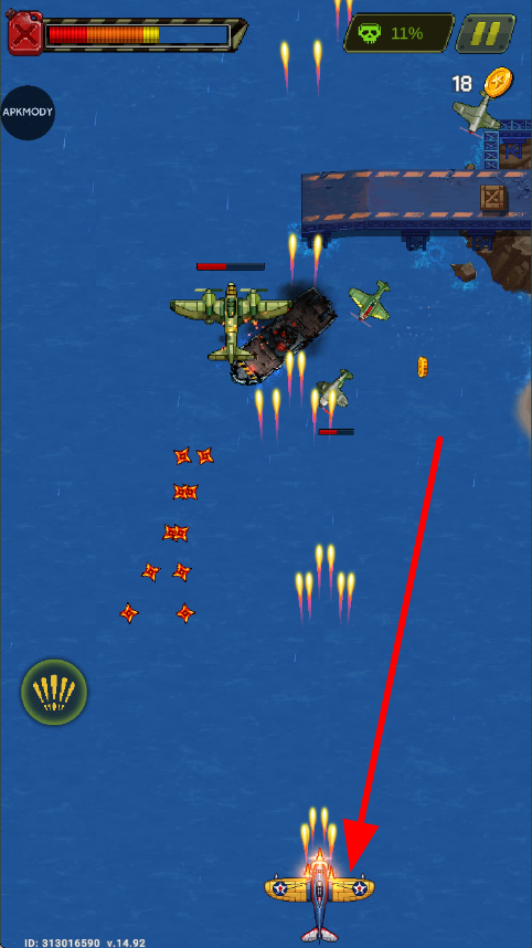 1、操控飛機在畫面中左右移動,躲避敵人的攻擊,同時調(diào)整位置,讓飛機能更好地對敵人發(fā)起進攻,在復(fù)雜的戰(zhàn)場環(huán)境中靈活穿梭。