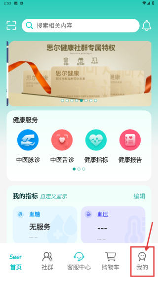1、打開思爾健康應(yīng)用,點(diǎn)擊底部我的選項(xiàng),進(jìn)入個(gè)人中心頁面。