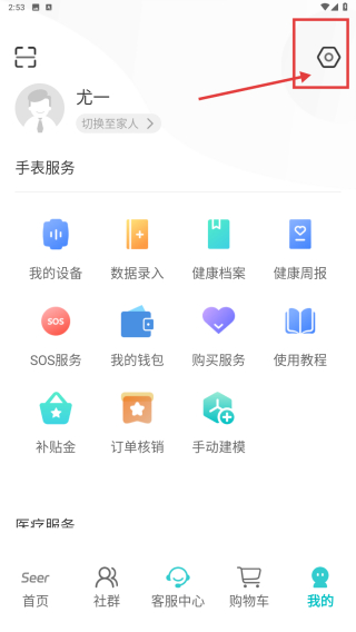 2、在個(gè)人中心,點(diǎn)擊右上角設(shè)置圖標(biāo),進(jìn)入設(shè)置功能區(qū)。