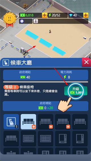 3、當(dāng)候車大廳滿足需求條件時,可建設(shè)超市,花費(fèi)資金升級超市,為乘客提供零食、飲料等商品購買服務(wù)。