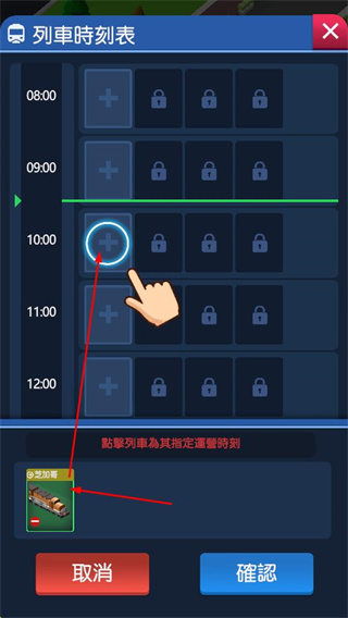 4、在列車時刻表界面,點(diǎn)擊列車對應(yīng)的加號,為列車指定運(yùn)營時刻,設(shè)置好后點(diǎn)擊確認(rèn),安排列車的運(yùn)營時間。