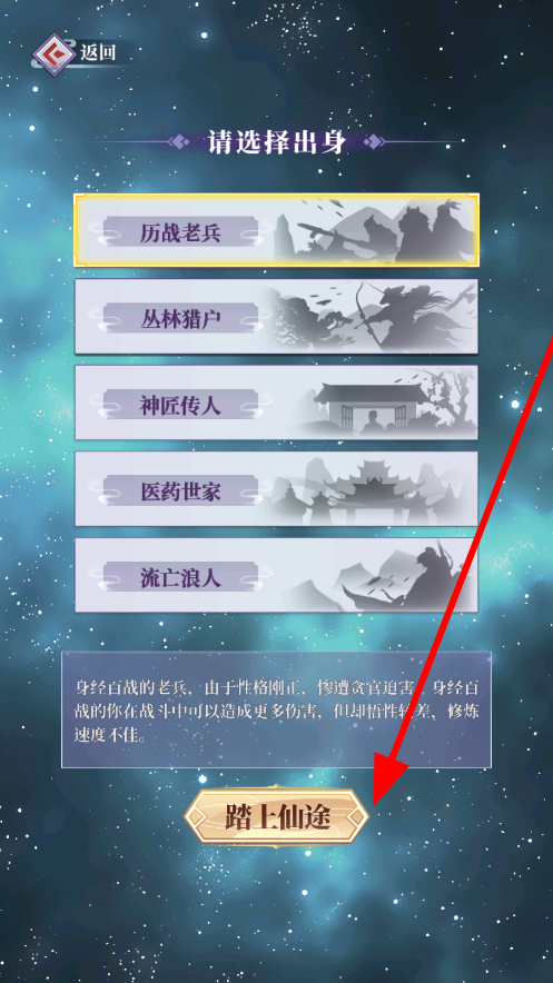 1、請(qǐng)選擇出身界面,有歷戰(zhàn)老兵、叢林獵戶等多種身份可選,挑選心儀的身份后,點(diǎn)擊踏上仙途,正式開啟修仙歷程。