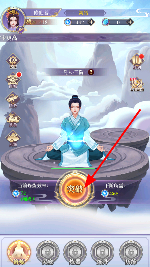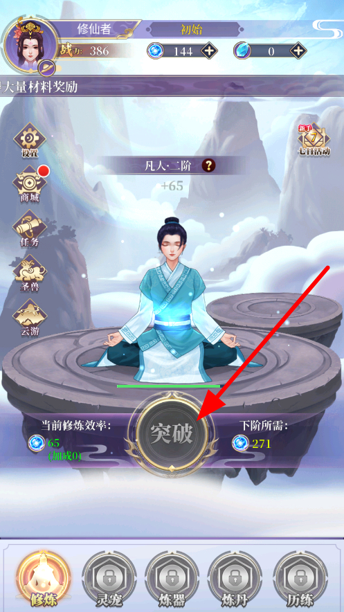 3、當(dāng)修煉經(jīng)驗(yàn)積累到當(dāng)前階段所需的滿值后,點(diǎn)擊突破按鈕,嘗試突破當(dāng)前境界,突破過程中需滿足條件,如足夠的經(jīng)驗(yàn)值等。