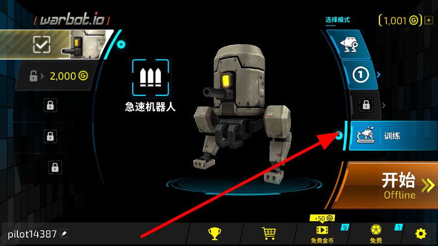 1、開局游戲首先在模式選擇界面,挑選想要體驗(yàn)的模式,比如訓(xùn)練模式等,然后點(diǎn)擊開始,進(jìn)入游戲準(zhǔn)備階段。