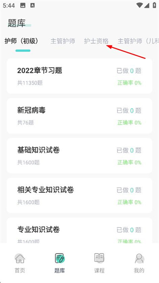 2、在題庫頁面,點(diǎn)擊護(hù)士資格,切換到護(hù)士資格題庫分類。