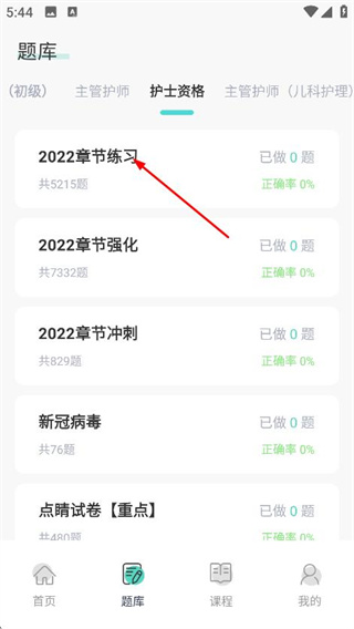 3、在護(hù)士資格題庫分類下,點(diǎn)擊2022章節(jié)練習(xí),進(jìn)入該練習(xí)的題目頁面。
