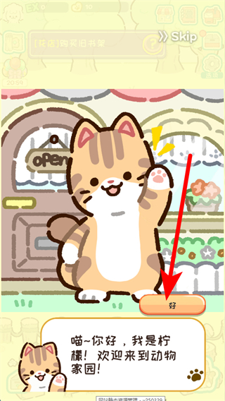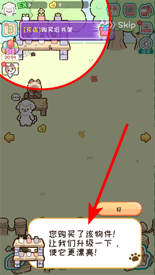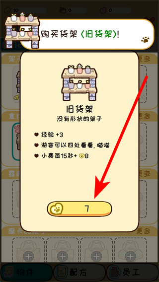 1、進入游戲后,會有可愛的動物角色引導,點擊相關(guān)提示按鈕,可查看購買貨架的選項,花費指定數(shù)量的貨幣就能購買舊貨架等物品。