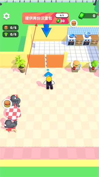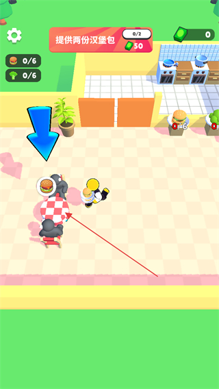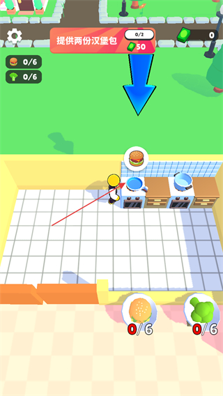 1、接取任務(wù),看到提供兩份漢堡包提示后,操控角色前往廚房區(qū)域。
