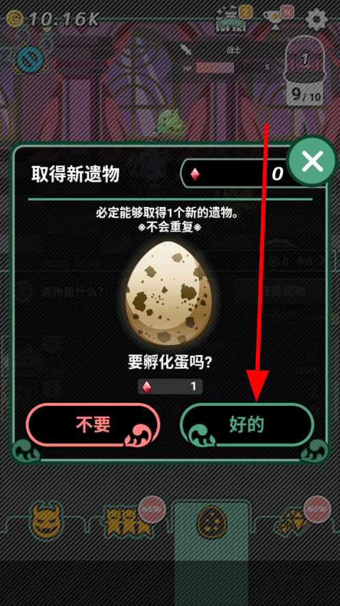 4、若有足夠的孵化的資源,點擊好的,孵化蛋,從而取得新的遺物,這些遺物能為角色帶來不同的助力效果。