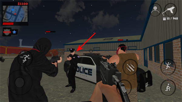 4、與敵人如警察交戰(zhàn)時,利用購買的武器進行射擊,可獲取金錢和經(jīng)驗,推進進程,完成任務。