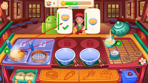2、準(zhǔn)確將餐品分發(fā)給對(duì)應(yīng)的顧客,滿足顧客的需求,完成訂單后可獲得金幣等獎(jiǎng)勵(lì),同時(shí)進(jìn)度條會(huì)推進(jìn)。