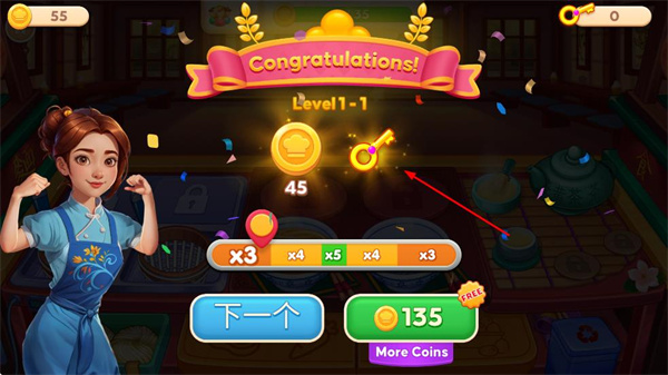 3、成功完成關(guān)卡后,會(huì)獲得Congratulations!的祝賀,還能選擇下一個(gè)進(jìn)入下一關(guān)或花費(fèi)金幣獲取更多獎(jiǎng)勵(lì)。
