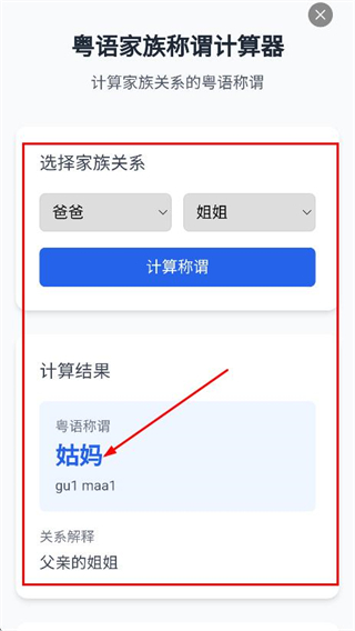 3、隨后我們可以點擊后,可查看計算結(jié)果粵語稱謂姑媽及關(guān)系的解釋。