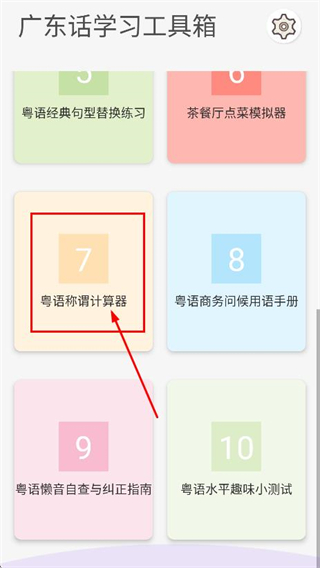 1、在學習工具箱頁面,點擊粵語稱謂計算器,進入粵語家族稱謂計算器頁面。