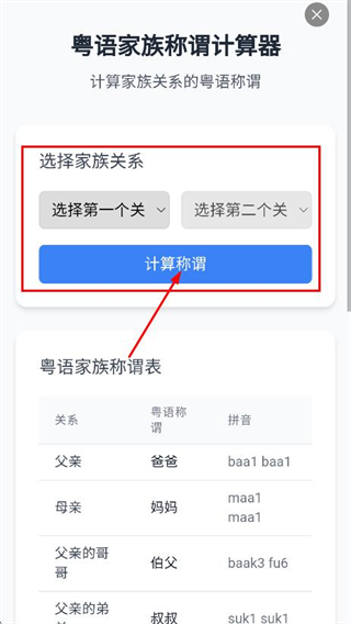 2、在粵語家族稱謂計算器頁面,選擇家族關(guān)系選擇關(guān)系后,點擊計算稱謂。