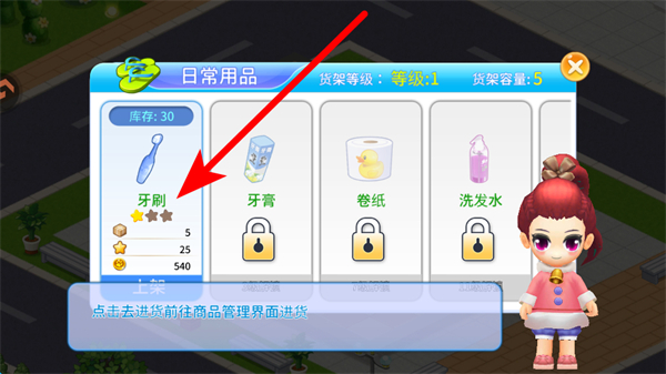 2、完成店長選擇,點(diǎn)擊店鋪內(nèi)的進(jìn)貨按鈕,打開商品選項(xiàng)界面,挑選合適商品進(jìn)行上架,做好迎接顧客的準(zhǔn)備。