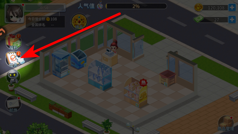 4、點(diǎn)擊任務(wù)按鈕,完成各類經(jīng)營任務(wù),獲取獎(jiǎng)勵(lì),同時(shí)可豐富商品種類,不斷優(yōu)化商店,吸引更多顧客進(jìn)店購物。